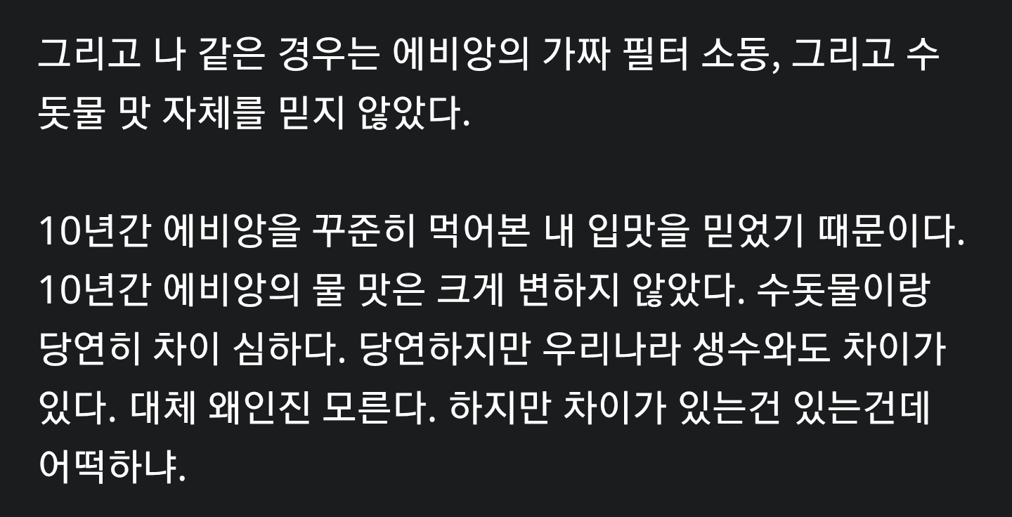 10년간 에비앙을 꾸준히 먹어본 내 입맛을 믿었기 때문이다. 10년간 에비앙의 물 맛은 크게 변하지 않았다. 수돗물이랑 당연히 차이 심하다. 당연하지만 우리나라 생수와도 차이가 있다. 대체 왜인진 모른다. 하지만 차이가 있는건 있는건데 어떡하냐.