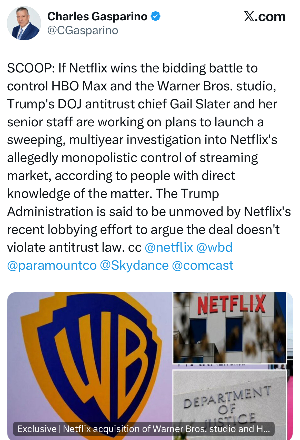 트럼프 행정부의 법무부 산하 반독점 담당 게일 슬레이터와 직원들이 넷플릭스의 스트리밍 시장 독점관련 대규모 감사 들어갈 예정.