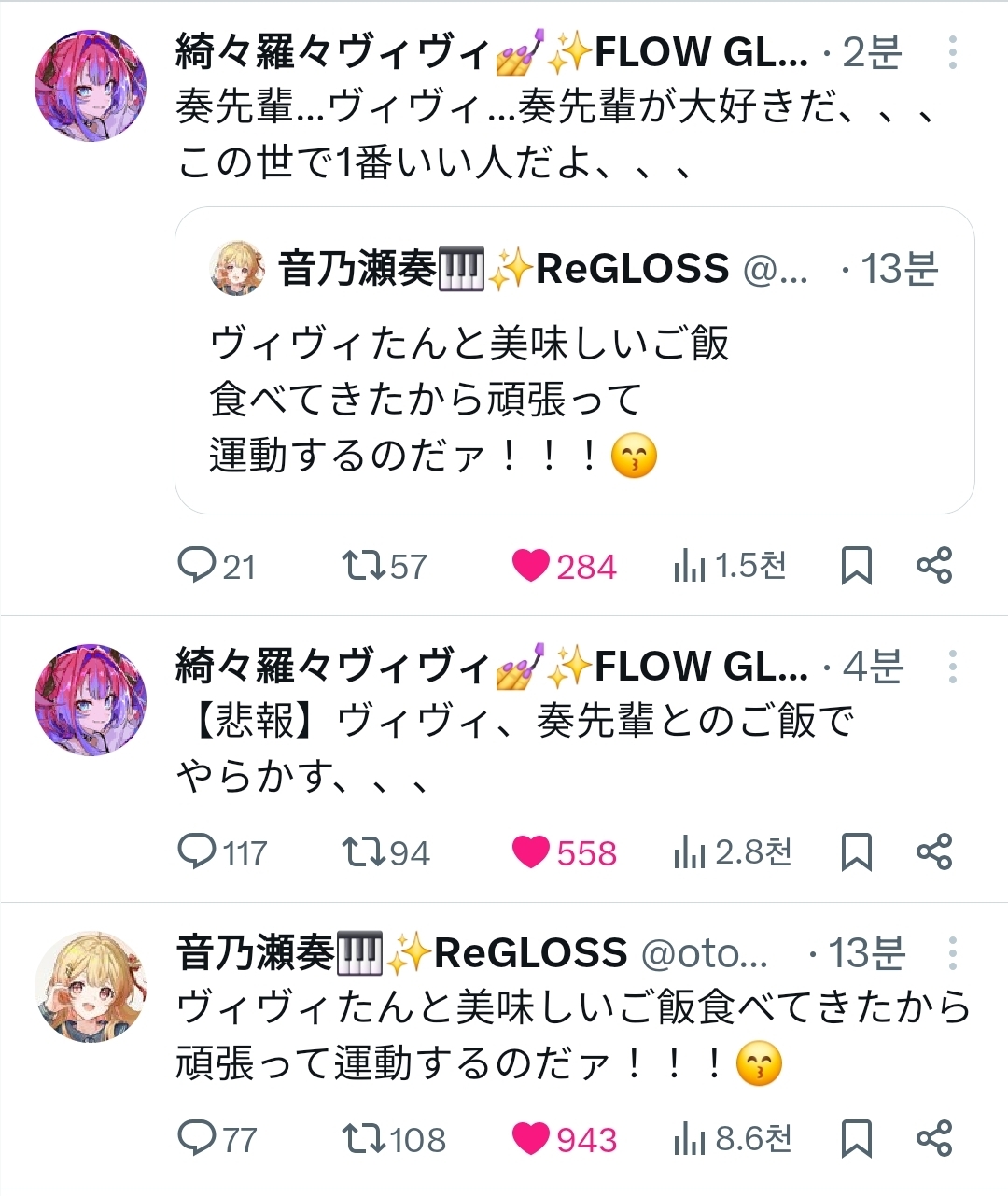 비비 : (13분 전 카나데 트윗에 인용을 걸며) 카나데 선배... 비비... 카나데 선배를 정말 좋아해요...이 세상에서 제일 좋은 사람이야...