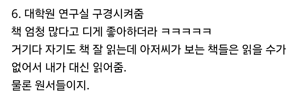 거기다 자기도 책 잘 읽는데 아저씨가 보는 책들은 읽을 수가 없어서 내가 대신 읽어줌.