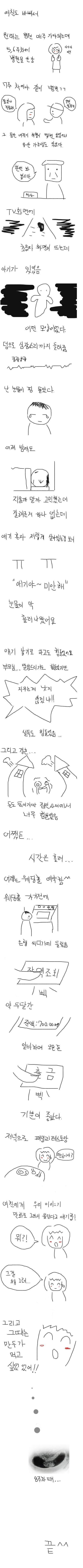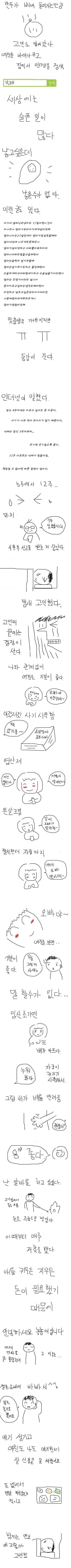 1. 여자친구 임신했는데 낙태할까 고민하다가 우여곡절 끝에 애를 낳기로 하고 결혼을 약속하는 만화를 남자친구가 그려서 인터넷에 올림.