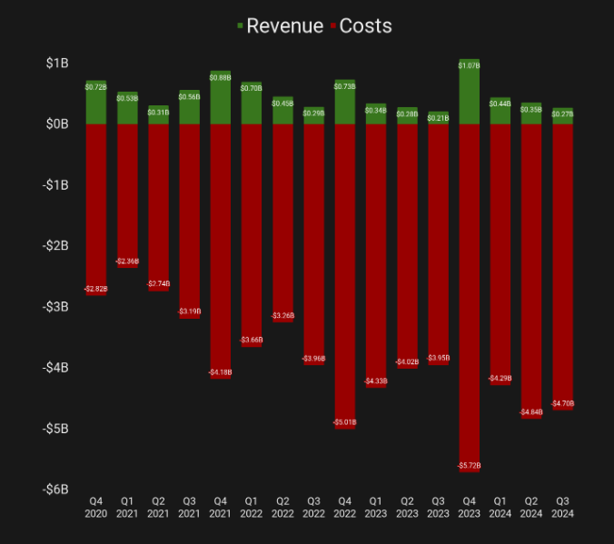 Quest 3S조차도 Reality Labs를 수익으로 이끌지는 못할 것입니다. 2억 7천만 달러의 3분기 수익은 무려 46억 7천만 달러의 비용과 함께 발생하여 분기별 "손실"은 약 44억 달러였습니다.