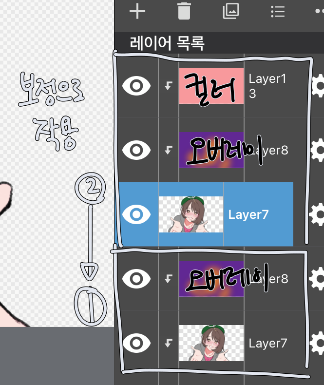++여기서 주의할 점은, 컬러 레이어를 얹어준 레이어도 일종의 효과를 내는 레이어라서, 기본 베이스가 되는 그림을 유지해야해