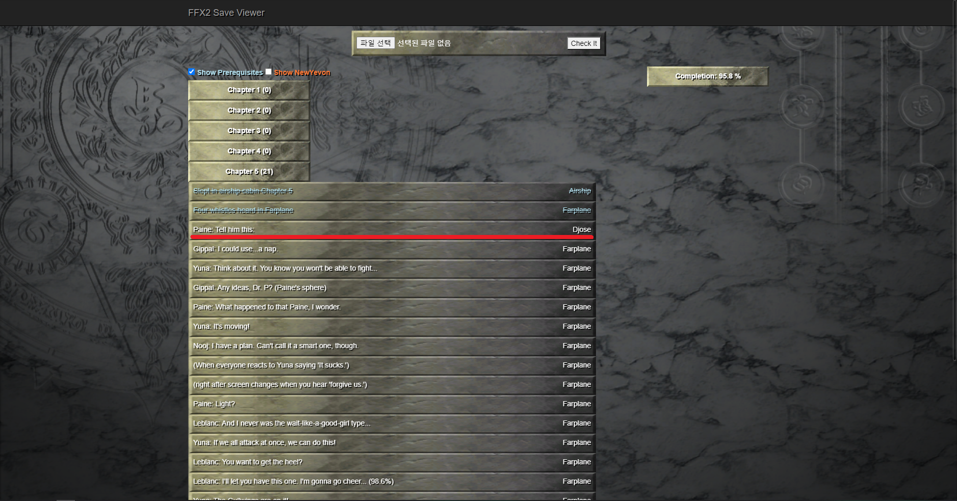 세이브파일 올리면 달성율 누락된게 뭔지 알려주는 사이트가 있길래 저기서 확인해보니까 지금 조제사원에서 파인 대사 하나가 빠져서 달성율 0.2%가 부족한 것 같습니다.