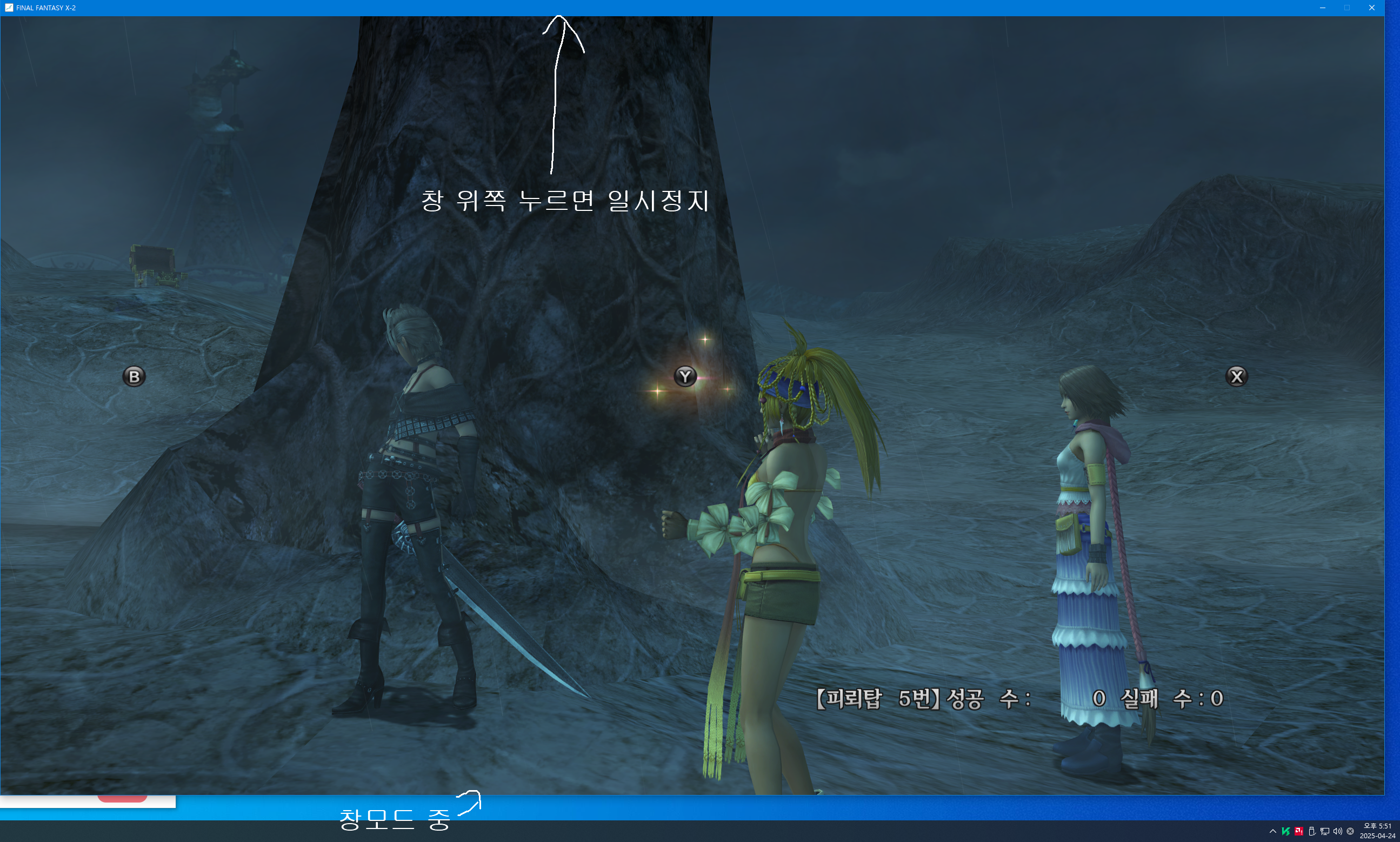 3. 그 순간에 마우스로 프로그램창(파판10-2 창) 위쪽을 누르고있음 / 예를들어 윈도우창 이동시킬때 창 위쪽누르고 이동시키듯