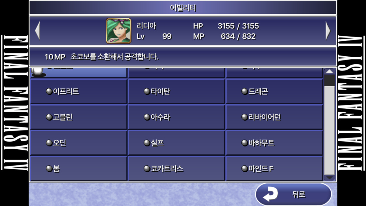 리디아의 소환마법 스샷입니다. 고블린은 1회차 초반에 얻어서 순서가 앞에 있고 이후에 3개 얻은 것은 맨 뒤에 위치하고 있습니다.