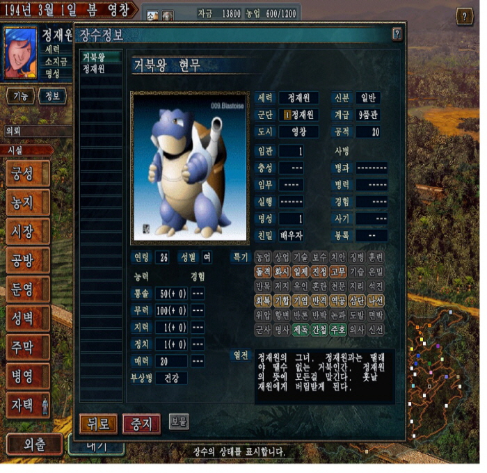 현무일족의 계승자이며 포켓몬 마스터 정재원 그의 한결같은 마누라 거북왕 반갑게 맞이해주는 거북왕양 복팩을 쓰는게 안타까워서 용돈을 주는거임. [대인배] 꼴에 자존심은 있어가지고 역시 째원이한테 거북왕뿐인거임. 이건 수정하기전 차후 째원의 휘하 장수 출연 시킬 예정. 젯셋,녹색번개,레모나르대제,붕가네이터,불멸 박보영 등등