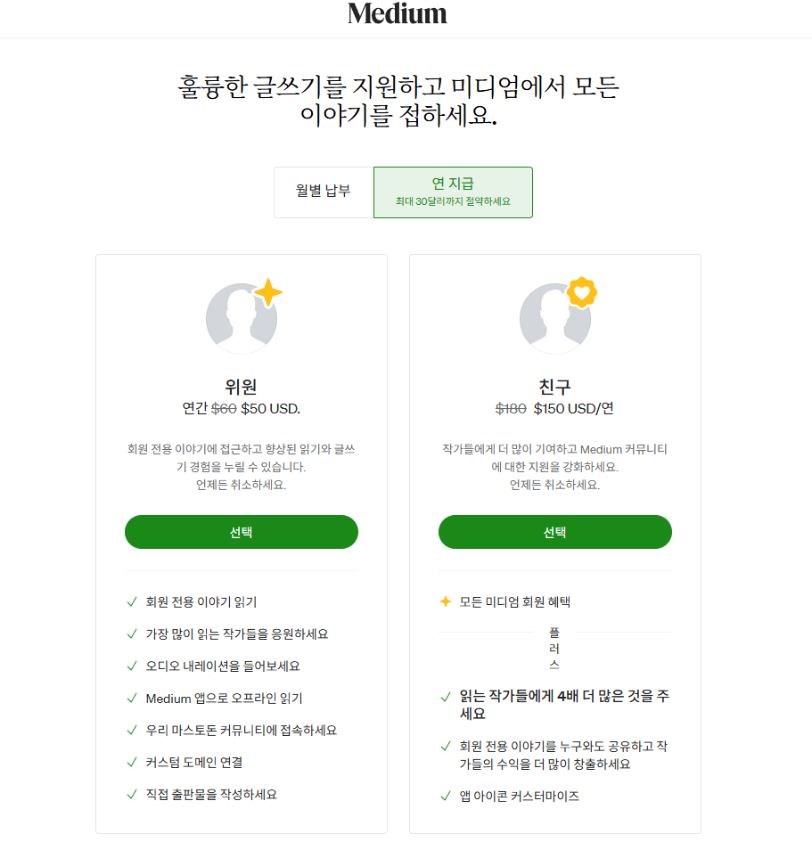 1년 구독료는 일시불로 결제하시면, 60달러 (약 8만원), 매달 결제하시면, 5달러 (약 6,750원)이며,
