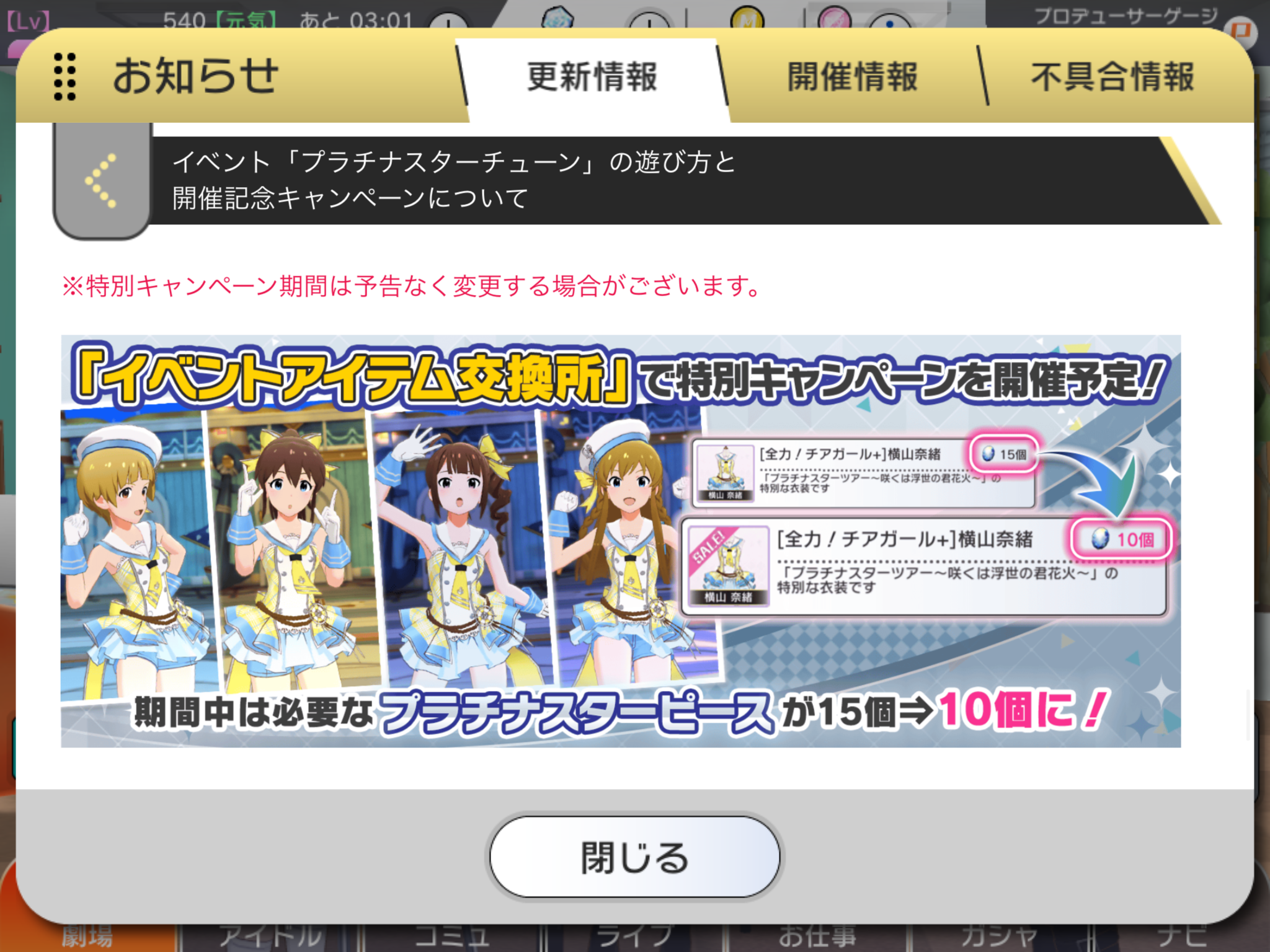 1) 과거 이벤트에 등장했던 의상 '전력! 치어걸' 멤버의 어나더 의상을 '극장 > 내비 > 샵 > 이벤트 아이템 교환소' 에 추가