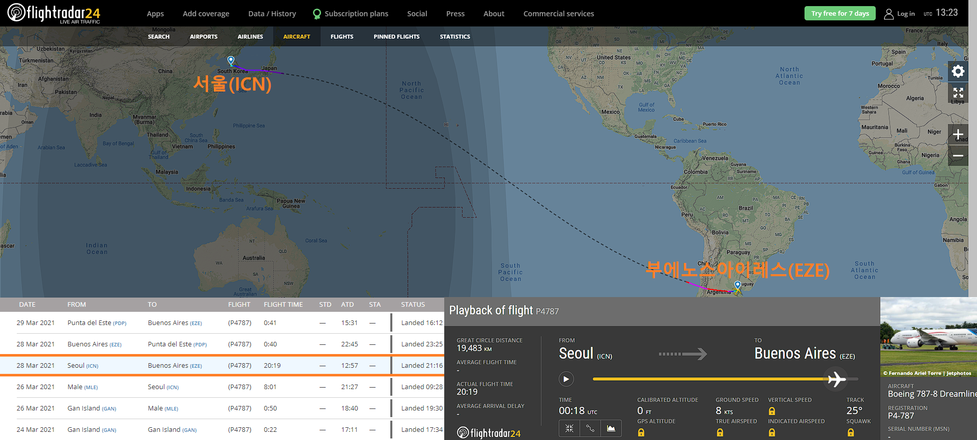 ※내용출처: https://www.flightradar24.com/data/aircraft/p4-787/ (플라이트레이더24 홈페이지)