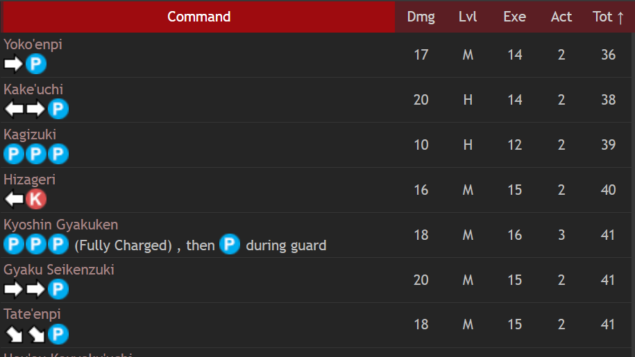 | 하단K/下段(게단) | 엘보는 반드시 확정히트 된다. 16~17중단 정도도 일반적인 상황에서는 안정적 |