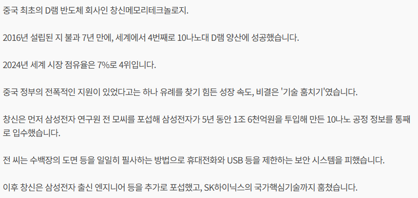 검찰은 CXMT가 경쟁력을 갖춘 10nm DRAM 공정을 개발하기 위해 삼성 출신의 핵심 인재들을 채용해 기술을 유출했다고 주장하고 있습니다. 삼성은 10nm DRAM 기술 개발을 위해 1.6조 원(약 10억 8천만 달러)을 투자했으며, SK hynix도 2024년 말부터 6세대 10nm DRAM 양산을 시작할 예정입니다. 하지만 CXMT는 이 기술을 부정하게 활용하여 2023년 최초로 10nm DRAM을 양산하게 되었습니다.