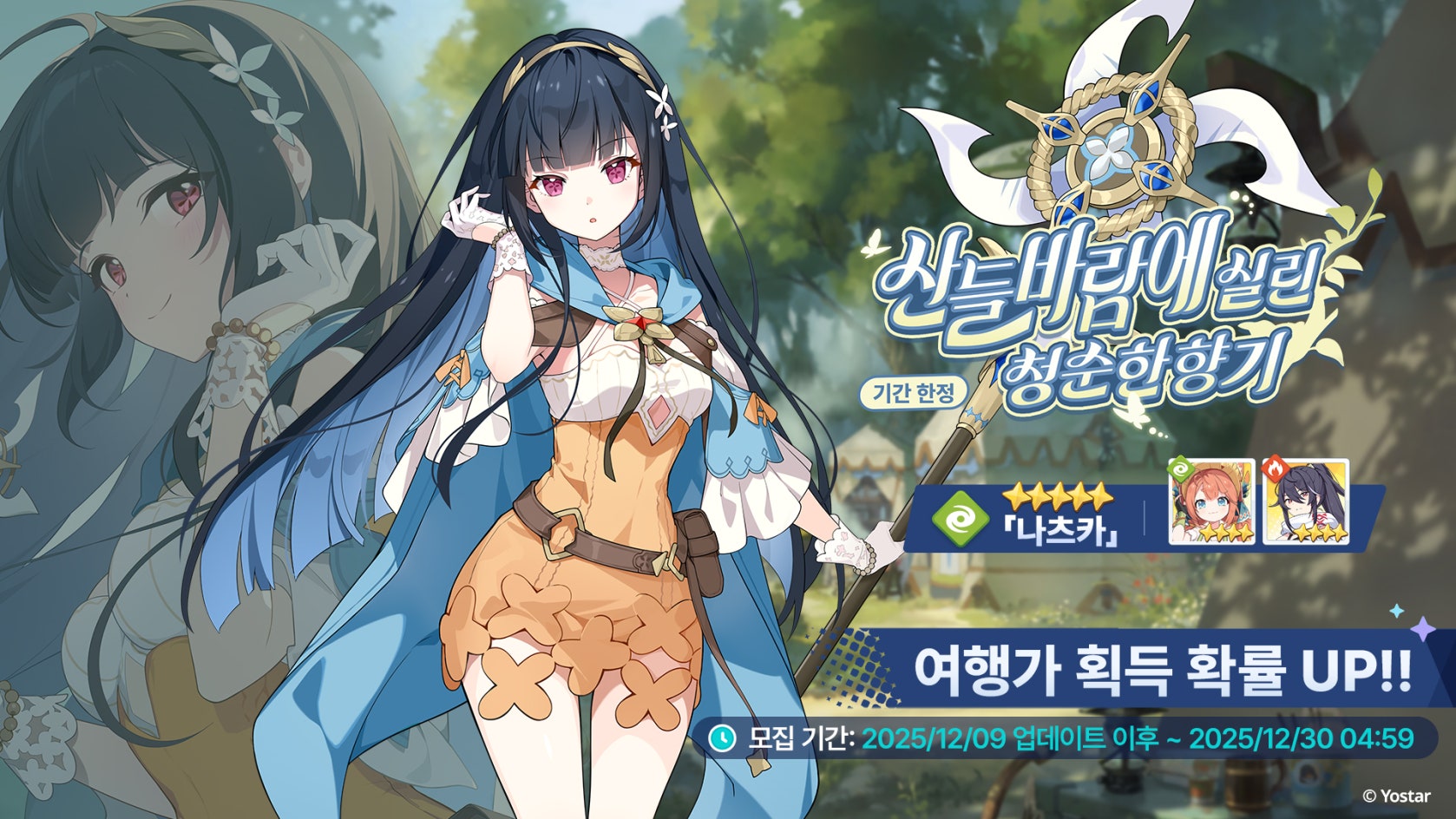 모집 설명:「산들바람에 실린 청순한 향기」기간 한정 모집 이벤트 오픈! 이벤트 기간 동안 새로운 ★5 여행가 「나츠카」의 모집 확률이 증가합니다. 최초 120회 모집 시 「나츠카」 1명을 추가로 획득합니다.