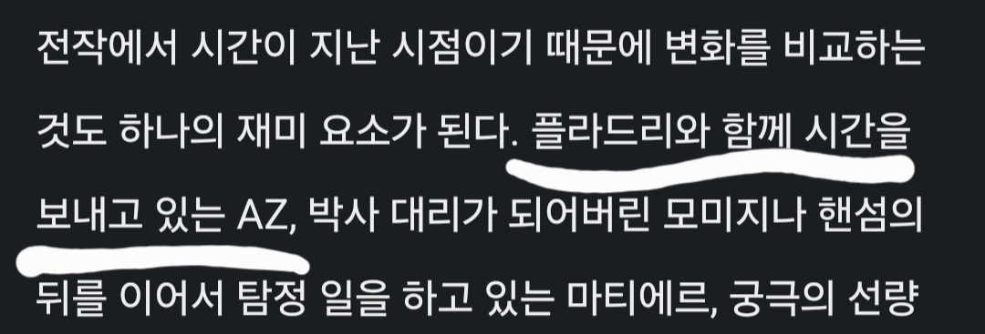 전작에서 시간이 지난 시점이기 때문에 변화를 비교하는 것도 하나의 재미 요소가 된다. 플라드리와 함께 시간을 보내고 있는 AZ, 박사 대리가 되어버린 모미지나 핸섬의 뒤를 이어서 탐정 일을 하고 있는 마티에르, 궁극의 선량배 카라스바 등 전작에서 등장한 인물들의 변화들이 즐거움으로 다가온다. 또한, 새로운 인물들의 매력적인 디자인도 한 몫을 거든다. 공간이 한정된 대신에 여러 인물들을 만나도록 해뒀고 각 인물들이 매력적인 외형과 성격을 보여주고 있다.