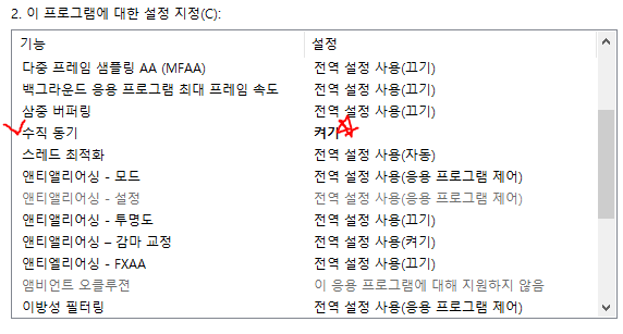 마지막으로 2. 이 프로그램에 대한 설정 지정 항목에서 스크롤을 내려보면 수직동기가 있습니다
