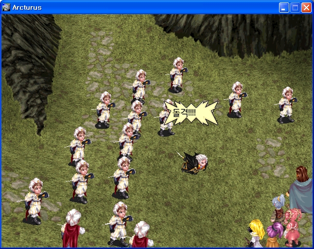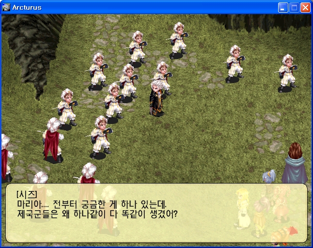 시즈의 그윽한 미소녀 눈매 공격에 나가떨어지는 제국병사.