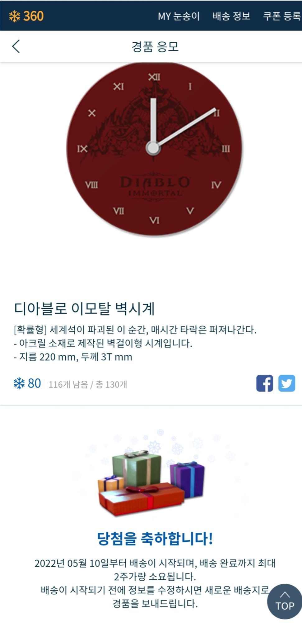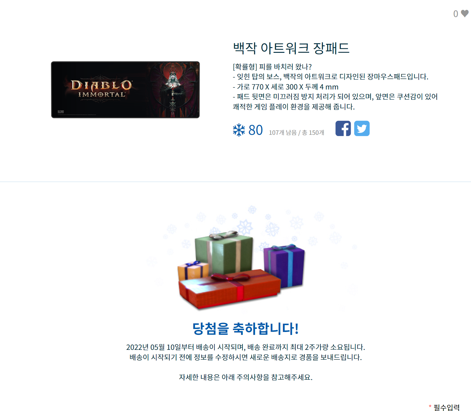 1주가 경품이 모두 소진되더라도 실망하지 마세요. 디아블로 이모탈 브랜드 페이지에서는 새로운 기회가 찾아옵니다! 매주 화요일 오전 11시 새로운 퀴즈와 새로운 눈송이 1천 포인트를 받을 수 있는 쿠폰, 새로운 굿즈가 공개됩니다.