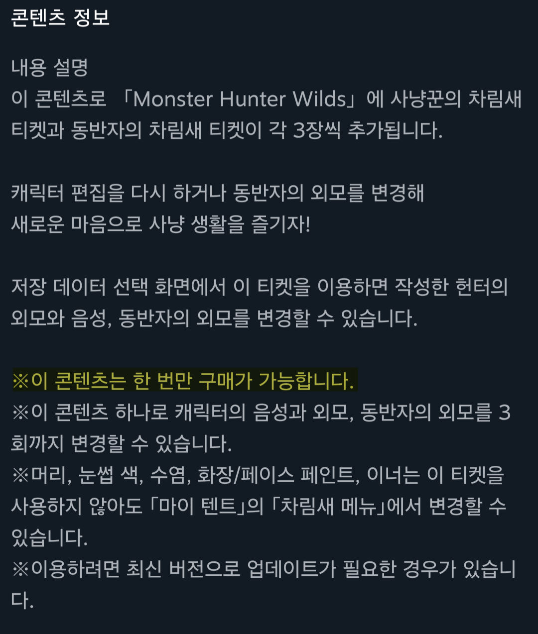 정확히 하자면, 첫 번째 외모 변경은 무료입니다. 하지만 그 이상 시도하려면 스토어에서 캐릭터 편집 DLC 3개 팩을 5.99달러에 구매해야 합니다.
