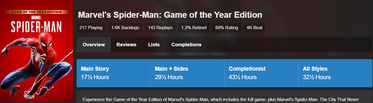 - 마블 스파이더맨 1은 약 12시간만에 스토리 클리어, 모든 컨텐츠 클리어는 17시간 걸림