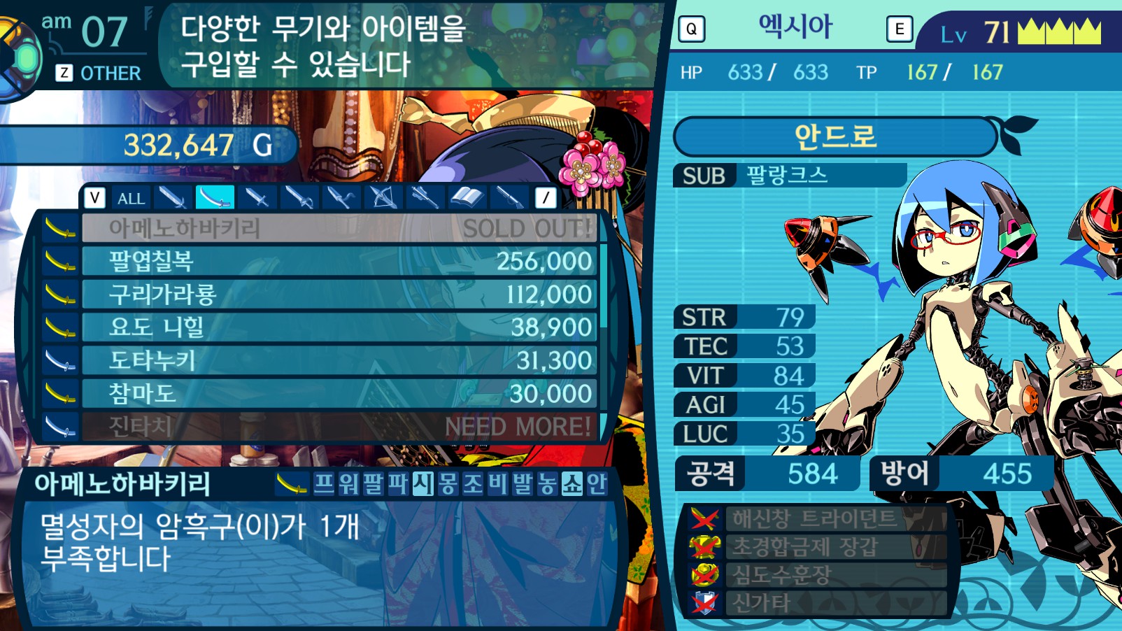 ↑ (히든보스 재료로 살수있는 최강의 도 아메노하바키리, 이미 구입해서 재고가없어용)