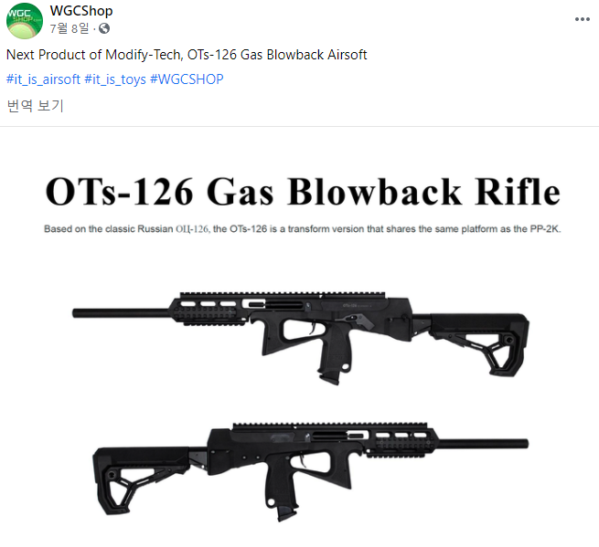 OTs-126 GBB 소식 PP-2000의 민수용 버전인 OTs-126이 PP-2000을 낸 적이 있는 모디파이에서 발매 예정 PP-2000과 하부를 공유하기 때문에 상부 컨버전 킷만 사서 교체 가능