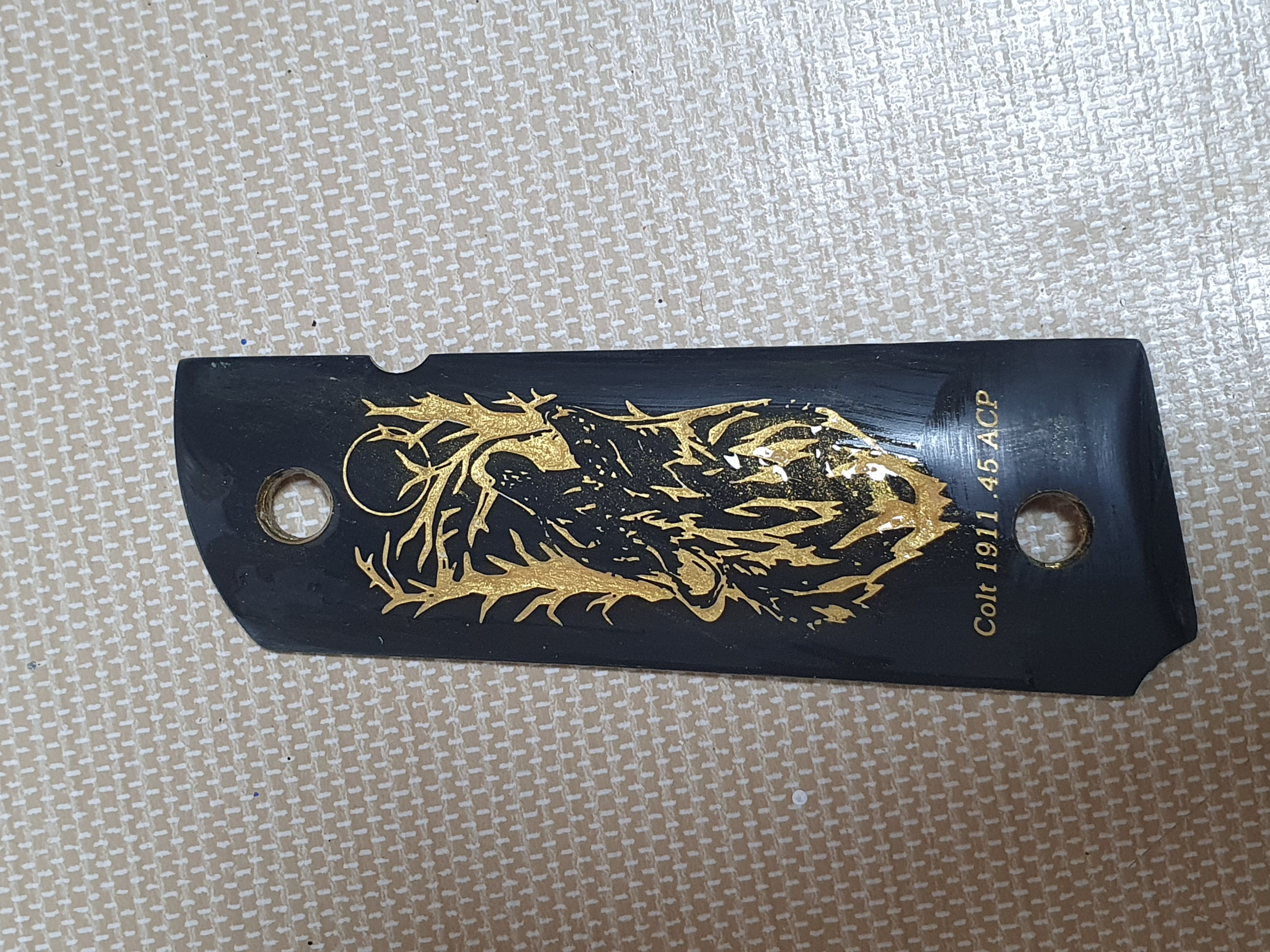3D 모델링을 통해 하울링 울프 금장 1911A1 그립으로 만들어봤습니다. 그림 디자인은 본인이 직접 그렸고, 레진 SLA프린터 블랙레진으로 출력했습니다~ 현재 1911A1이 없어서.. 구글에서 찾은 칼라파트 있는 사진에 합성했네요. 짧지만 봐주셔서 감사합니다~ ^^;